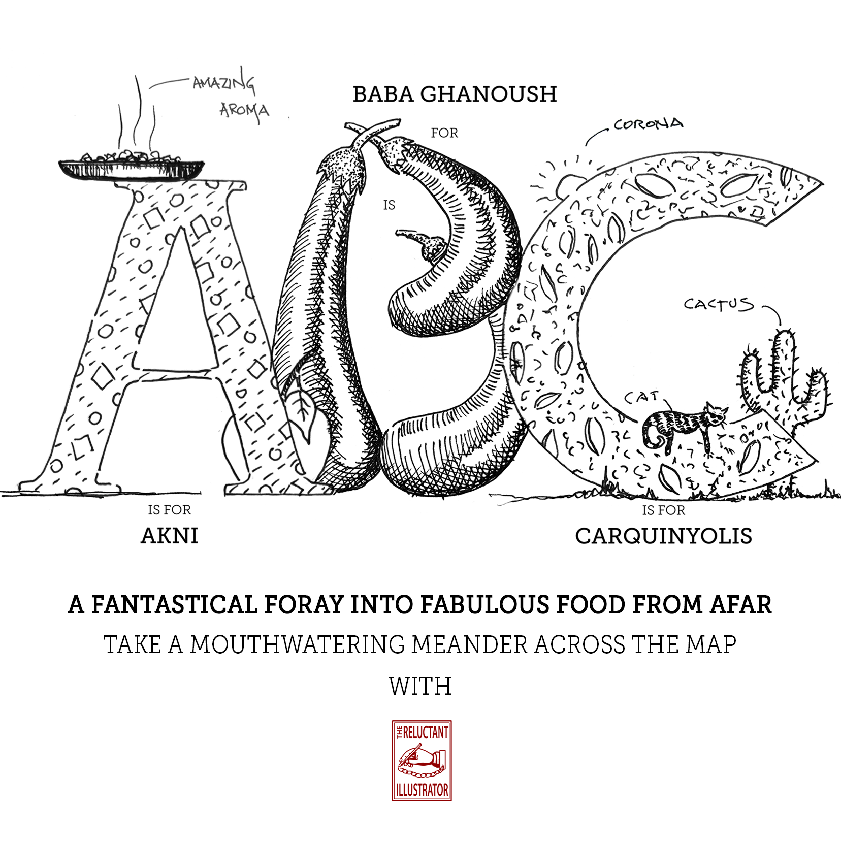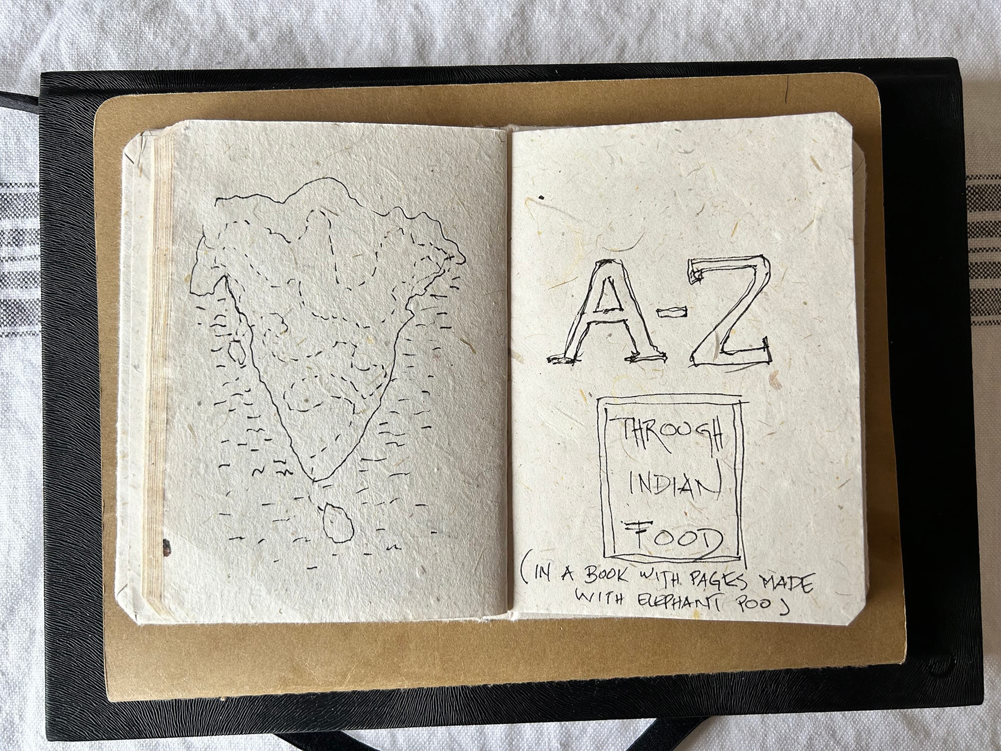 My first stab at the ABC Food book was made as a series of super quick sketches in a little handmade notebook... a gift that I received and returned, all sketched up.