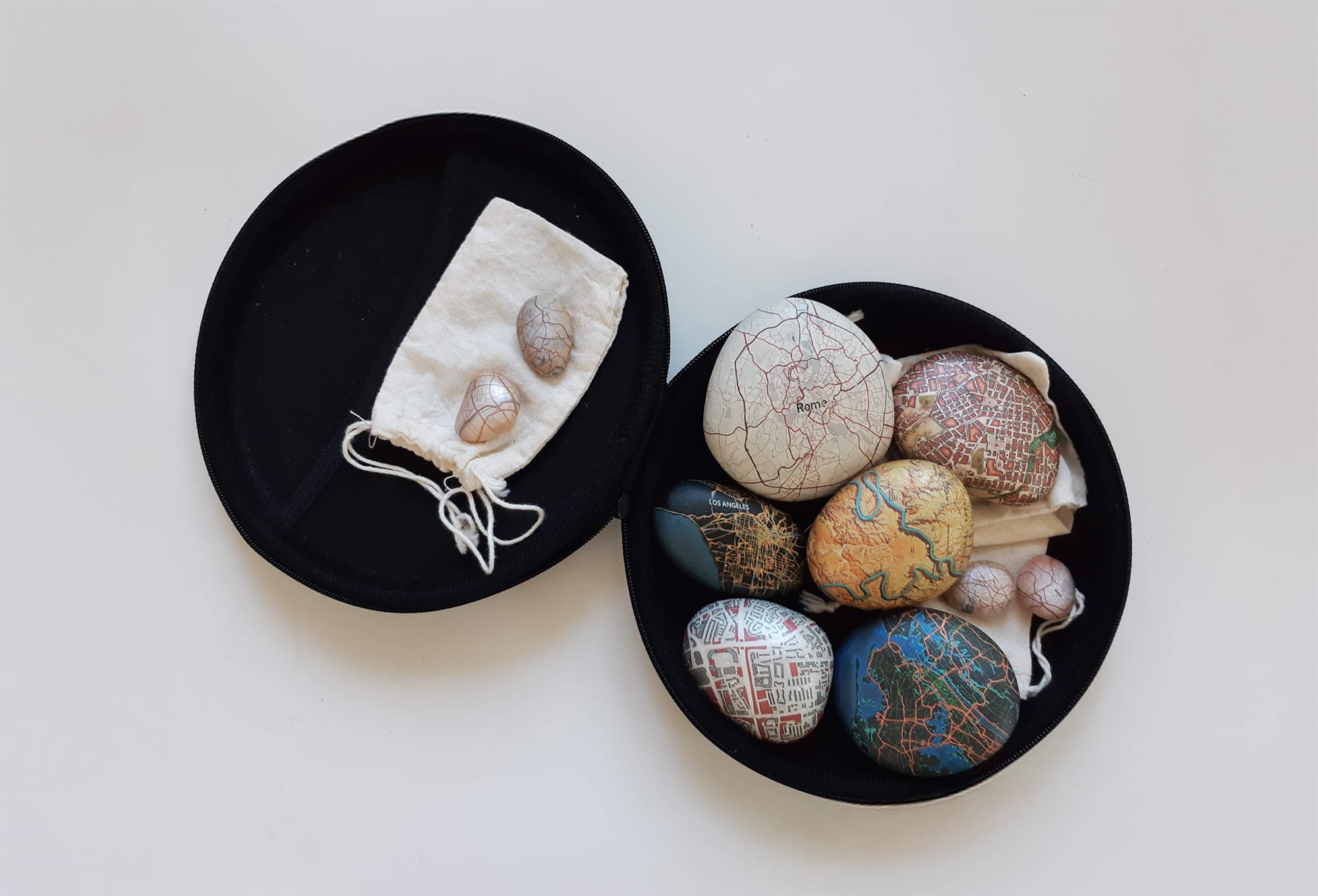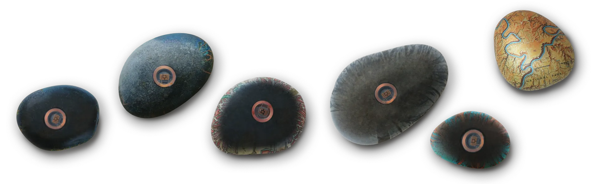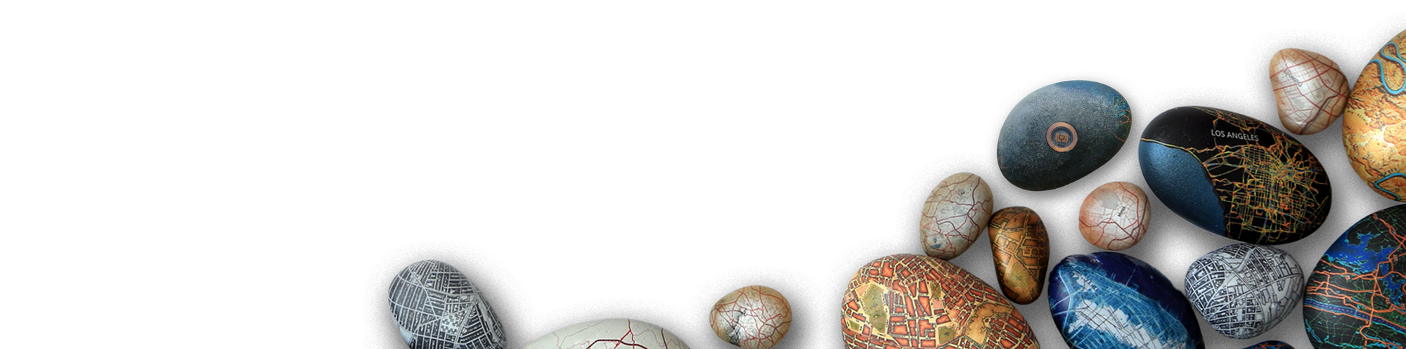The object: Smooth river stones, each hydrographically imprinted with a custom map of any place on Earth; a beautiful, tactile, hand-held, personal talisman and pocket pet.