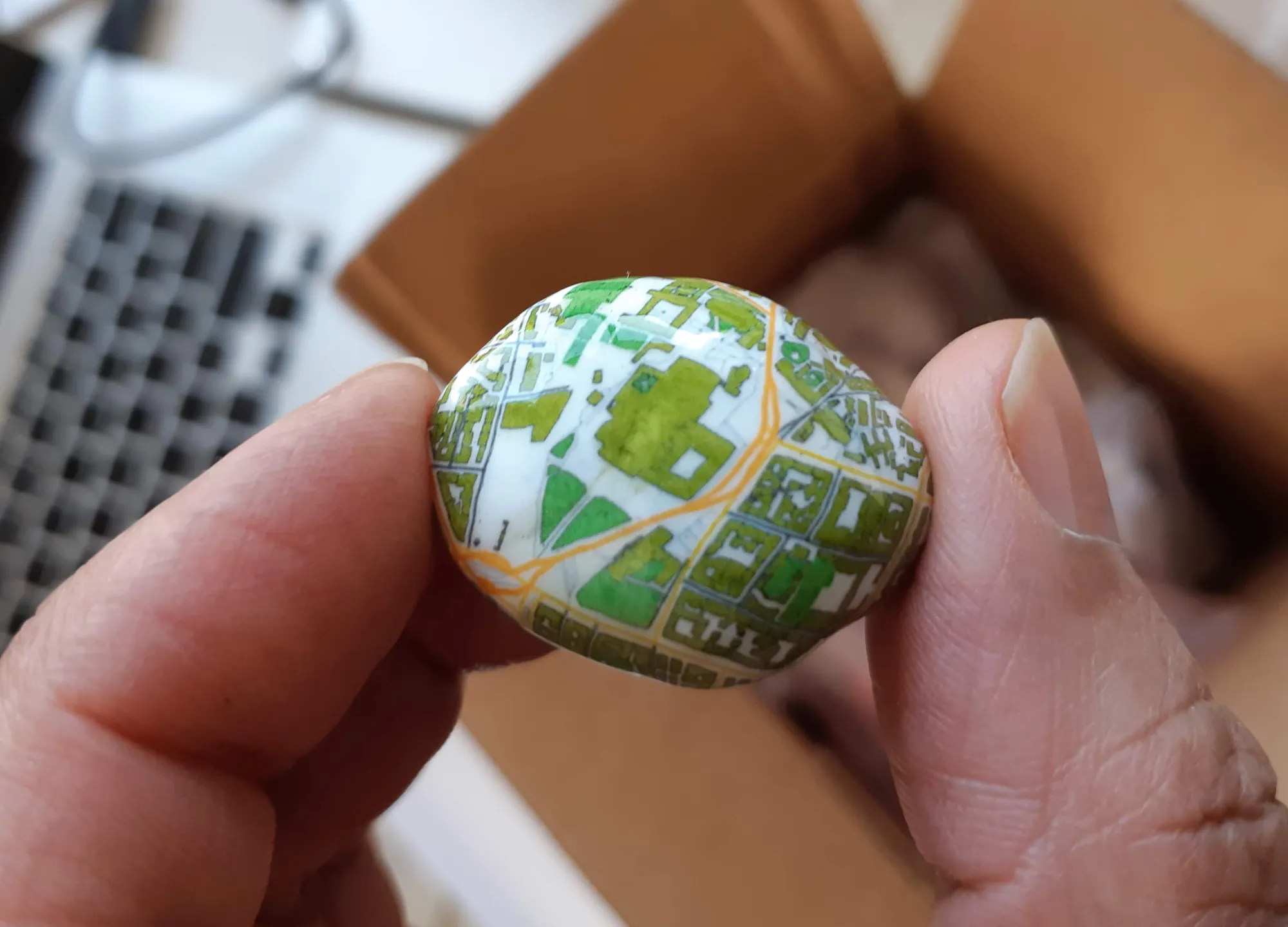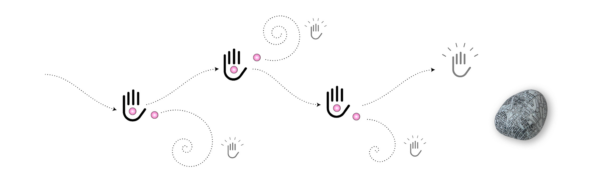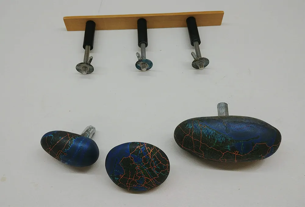 The object: Smooth river stones, each hydrographically imprinted with a custom map of any place on Earth; a beautiful, tactile, hand-held, personal talisman and pocket pet.